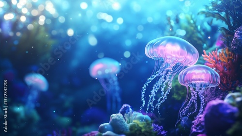 © decorator, Naklejka premium Stunning 3d render of glowing jellyfish in a colorful coral reef underwater wonderland