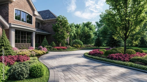 © arthit, Fototapeta premium Stunning 3D-rendered front yard with a round driveway, featuring a paver area and meticulously landscaped garden beds. Ideal for showcasing residential curb appeal.