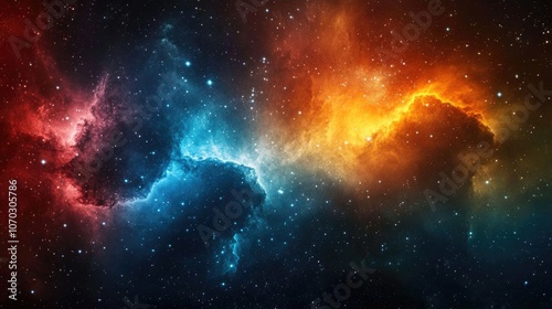 © CreativeOstad, Naklejka premium Stunning Deep Space Nebula with Vibrant Interstellar Clouds in Shades of Red, Blue, Orange, and Yellow Set Against a Starry Galactic Background