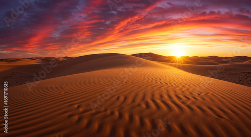 © SULTAN, Naklejka premium Stunning desert dunes bathed in golden sunset light with vibrant, fiery clouds above