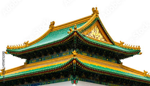 Fototapeta premium Stunning detailed view of a traditional Chinese temple roof with vibrant green and gold accents