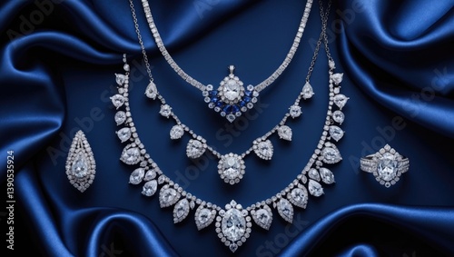 Fototapeta premium Stunning diamond jewelry displayed against a blue backdrop. Banner. Design. Overhead view.