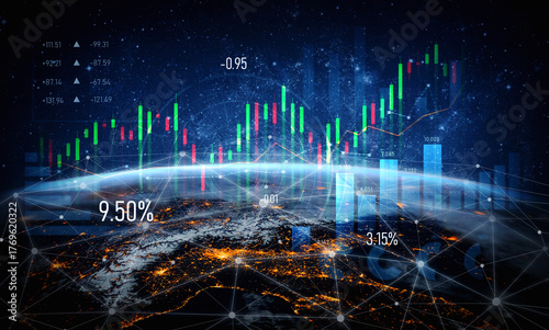 Obraz premium Stunning digital visualization of global stock market trends with colorful financial graphs and data overlays, enhancing the view of Earth at night. Scalp