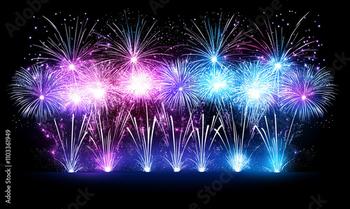 Naklejka premium stunning display of colorful fireworks lighting up night sky, creating vibrant and festive atmosphere. bright bursts of pink, blue, and white sparkles evoke joy and celebration