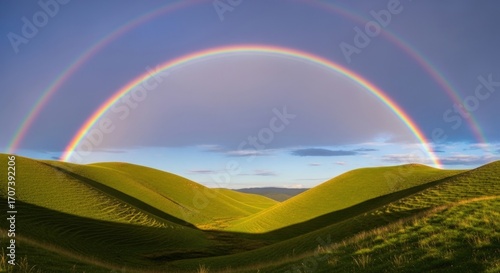 © Haider, Naklejka premium Stunning double rainbow arches over vibrant green rolling hills creating a magical landscape scene