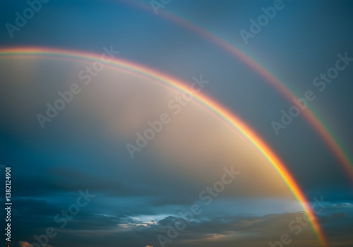 Fototapeta premium Stunning Double Rainbow Arcs Across a Cloudy Sky Vibrant Colors, Weather...