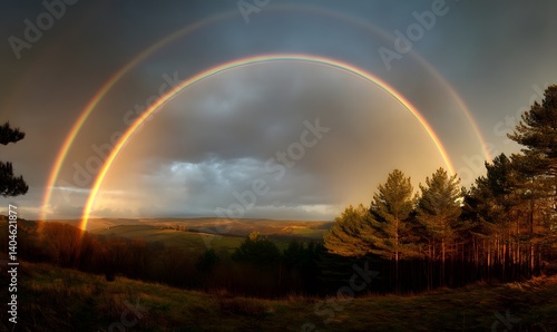 Naklejka premium Stunning Double Rainbow Over Rolling Green Hills and Majestic Pine Trees Dramatic Sky Landscape Photography Nature Beauty Awe Hope