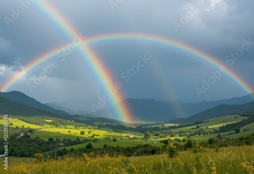 © Kitta Studio, Naklejka premium Stunning Dual Rainbow Over Lush Green Valley in Majestic Mountains