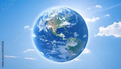 Fototapeta premium Stunning Earth Globe Image A Vibrant View of Planet Earth Against a Clear Blue Sky with Fluffy White Clouds