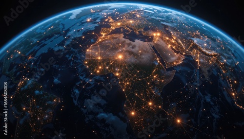 Obraz premium Stunning earth globe view with glowing city lights illuminating continents, symbolizing global connectivity and networks, ideal for technology and business themes