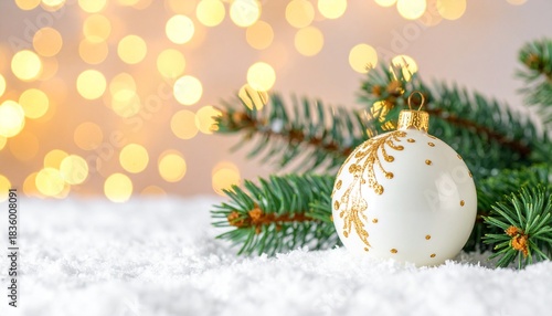 © mohammad, Fototapeta premium Stunning elegant white Christmas ornament with gold detail rests gently on fresh snow beside vibrant evergreen branch with warm bokeh lights