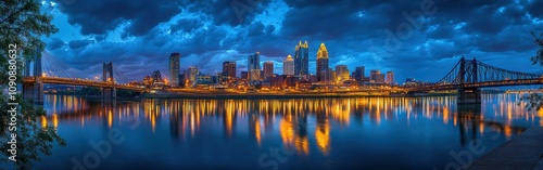Obraz premium Stunning evening view of the Cincinnati skyline reflecting in the river under a dramatic sky