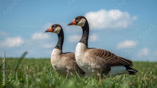 © AkuAku, Fototapeta premium Stunning farm birds grazing in a field