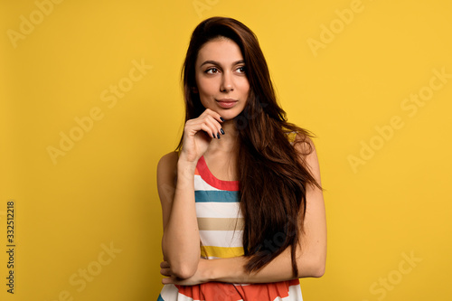 Fototapeta premium Stunning female model posing with face expression on yellow background....