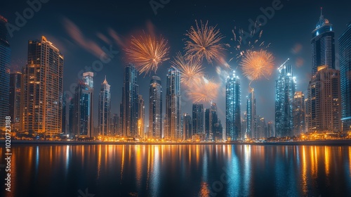 © Mandeep, Fototapeta premium Stunning fireworks display over modern city skyline at night