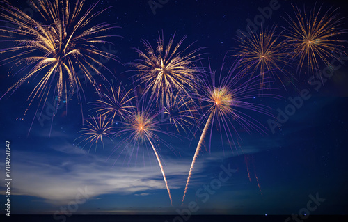 Fototapeta premium Stunning fireworks illuminate the night sky over the ocean, symbolizing...