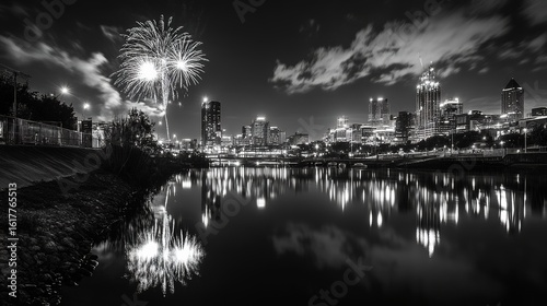 © Jong, Fototapeta premium Stunning fireworks over a city skyline reflected in a river.