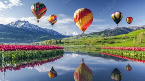 Fototapeta premium Stunning floating balloons reflect on a clear mountain lake surrounded by lush green hills