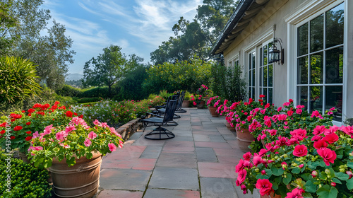 Obraz premium Stunning Garden Patio with Vibrant Flowers and Relaxing Seating Area