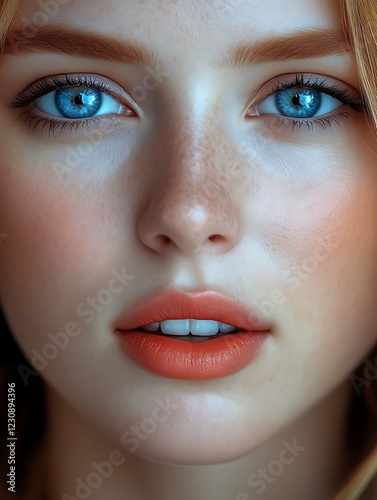 © tukang, Fototapeta premium Stunning Girl Portrait Blue Eyes Coral Lips Makeup