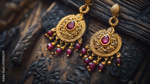 © Boonnam Burart, Obraz premium Stunning Gold Elaborate Earrings with Red Gemstones Hanging from Intricate Design on Wooden Background
