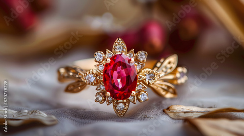 © Yiss Design, Fototapeta premium Stunning Gold Ring Featuring an Oval Ruby Surrounded by Diamonds