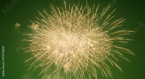 Fototapeta premium Stunning golden fireworks explode against vibrant green sky creating a magical festive atmosphere