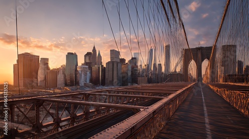 © artpoizzy, Fototapeta premium Stunning golden hour view of New York City skyline from Brooklyn, featuring Manhattan skyscrapers glowing at sunset by the East River.