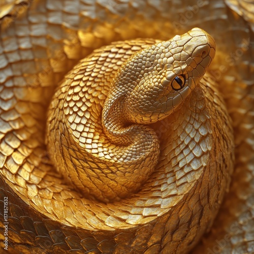 Fototapeta premium Stunning Golden Snake Coiled Elegantly on a Textured Surface, Capturing Light...