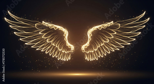 Naklejka premium Stunning golden sparkly angel wings on a black background symbolizing freedom...