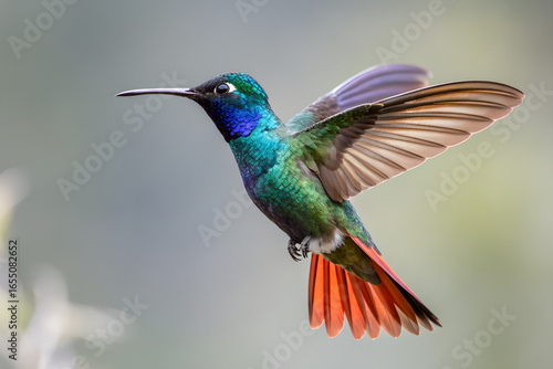 © Alhamdulillah., Fototapeta premium Stunning Golden-tailed Sapphire Hummingbird in Mid-Air Flight Generative Ai.