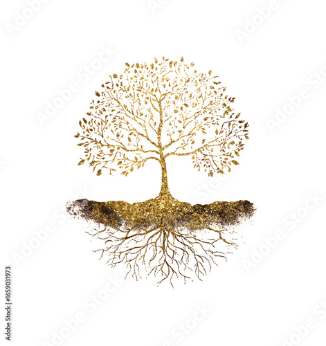 © Pixel Treasures, Naklejka premium Stunning golden tree with intricate root system illustration