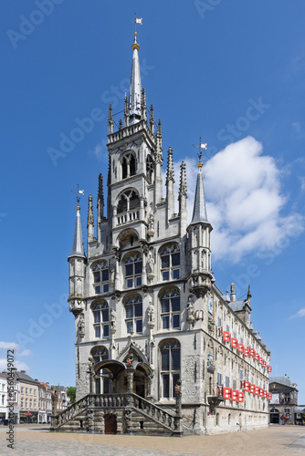 Fototapeta premium Stunning Gothic Town Hall of Gouda, Netherlands, adorned with red flags under...