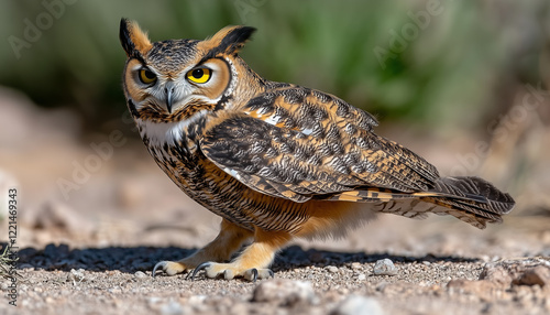 Obraz premium Stunning great horned owl perched confidently on sandy terrain captured with...