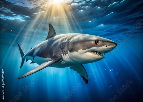 © prapatsorn, Naklejka premium Stunning Great White Shark Swimming in Clear Blue Ocean Waters - Captivating Underwater Predator Beauty