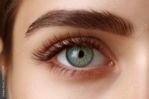 Obraz premium Stunning Green Eye Close-Up: Luminous Gaze, Defined Brows, Lush Lashes