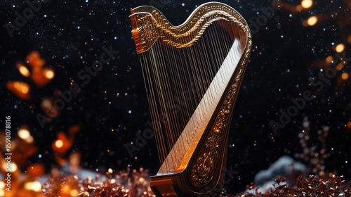 Fototapeta premium Stunning Harp Against a Dreamy Background of Sparkling Light and Bokeh, Perfect for Musical Themes and Artistic Concepts in Stock Imagery