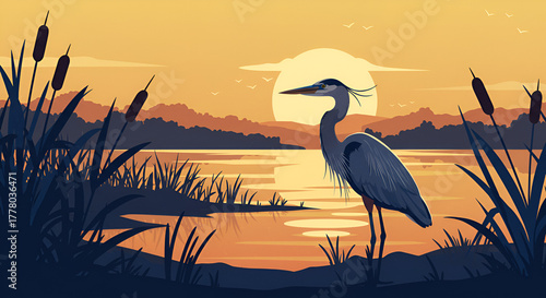 © Selamet, Fototapeta premium Stunning heron standing peacefully by the lake at sunset, a serene and tranquil nature scene perfect for relaxation and mindfulness projects