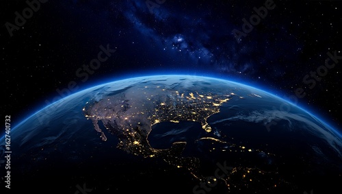 © Farheen , Fototapeta premium Stunning High-Resolution View of Planet Earth from Space at Night, Showcasing the City Lights of North and Central America and the Milky Way in the Background