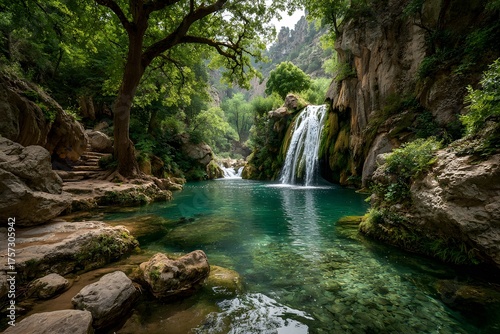 Fototapeta premium Stunning, hyper-realistic landscape photograph of a majestic waterfall...