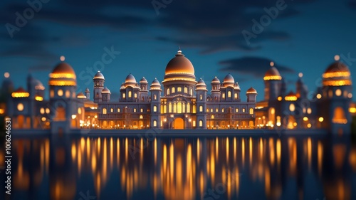 © Kin no Hikari, Fototapeta premium Stunning illuminated palace at night, reflecting on serene water.