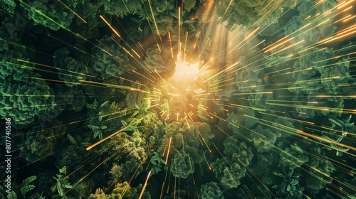 Obraz premium Stunning image of a sunburst effect amidst lush green forest with dynamic light streaks.