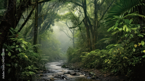 Fototapeta premium Stunning image of a torrential rainstorm in a lush tropical rainforest. It...