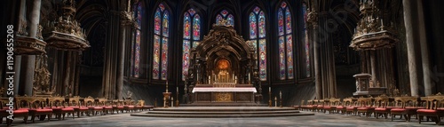 Fototapeta premium Stunning Interior of a Cathedral Featuring Colorful Stained Glass and Majestic Altar