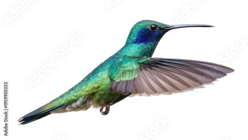 Obraz premium Stunning iridescent green and blue hummingbird soaring with wings...