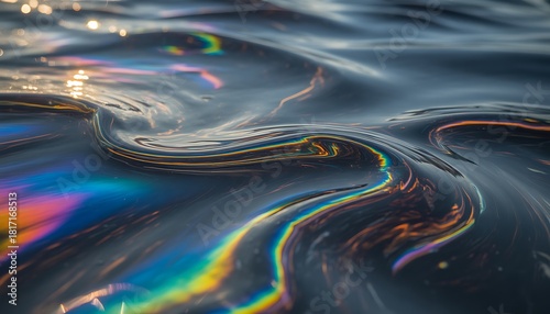 © Embabu, Fototapeta premium Stunning iridescent oil slick with rainbow colors shimmering on the water's surface for environmental awareness concepts
