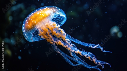 Naklejka premium Stunning jellyfish in the deep sea. Glowing orange and blue. Delicate tentacles