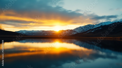 © Ps_Studio21, Fototapeta premium Stunning lake reflection at sunset with mountains.