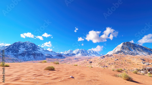 Naklejka premium Stunning landscape featuring vast desert with golden sand dunes, rocky mountains, and bright blue sky filled with fluffy