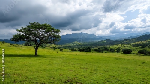 © Generative AI, Obraz premium Stunning landscape image of a single tree standing tall in a verdant green pasture under a cloudy sky : Generative AI